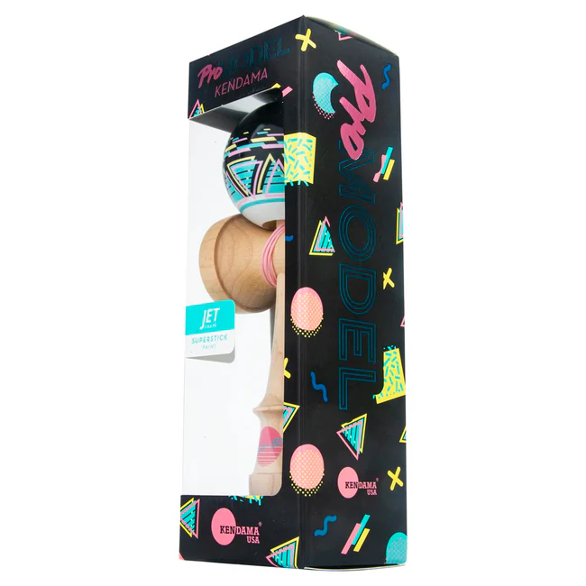 Kendama cu formă Retro - Jet, cu grafică neon retrowave și geometrie precisă, reglată pentru performanță profesională.